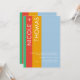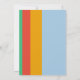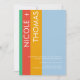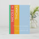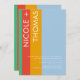 This modern, minimalist wedding invitation features bold vertical stripes in green, red, and yellow, set against a calming light blue background. The design combines clean typography with a personal touch, showcasing the couple's names in a handwritten font. The remaining details are in a sleek sans-serif style. The layout is simple, right-aligned, and easy to read, allowing for customization to suit your unique wedding details. Perfect for couples who love vibrant colours and a modern aesthetic, this invitation can be tailored to reflect your special day.
