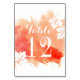 Modern abstract watercolor splash coral peach wedding table number place card featuring a hand painted watercolor paint splash with texture in tones of coral orange and peach, maple leaves in white with coral veins and text in white. This elegant and stylish casual wedding design is a completely customizable template perfect for your spring, summer or fall/autumn wedding. Note that this is only an image of watercolor and not real texture.