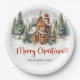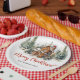 Classic Christmas plates with everlasting watercolor illustration at gingerbread house in winter pine forest with red holly berries and Christmas tree. Easily personalize the text or leave it blank.