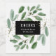 These trendy and stylish bottle labels feature botanical watercolor green leaves, with faux gold accents. There is a modern black frame in the centre of the design, with the word "cheers" and your name and special date in white. A fashionable and elegant design to add to wine bottles for wedding favours or for bridesmaid gifts or wedding party gifts.