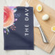 Personalized kitchen towel with a nice bouquet of watercolor roses with sprigs, leaves and branches all together in a colourful floral arrangement. Navy blue background.