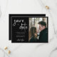 Minimalistic engagement photo wedding save the date in simple black and white with a modern whimsical handwritten calligraphy script. +++++++++++ Suitable for any season stylish modern theme weddings.
