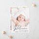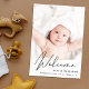 A modern card to announce your baby's birth, featuring his or her photo with "Welcome" written on top in a stylish script. Underneath add his or her name, birth date and birth stats. On the back, add three additional pictures and personalized message.