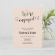 At its heart, this invitation showcases the words "we're engaged" in a captivating Calligraphy Script font, adding an air of whimsy and modernity that echoes the excitement of your love story. Complementing this exquisite script, the remaining text is presented in simple block fonts, thoughtfully curated in varying shades of black and dark grey. The centred alignment of all text elements creates a polished and crisp appearance, reflecting the clarity of your commitment.