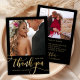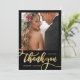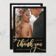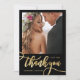 Modern Whimsical Boho Chic Huge Gold Calligraphy Script 2 Photo Wedding Thank You Card. Stylish wedding thank you template featuring a full vertical photo on the front with the text "Thank You" in a whimsical swirly hand lettering typography swash tail font script faux gold foil on black background. At the reverse side pre-made thank you message and one photo. Easily to personalize your name and thank you message. If you prefer to handwrite your note, just delete the sample text to make more space. If You need help or matching item, please contact to me!