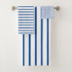 This fun set features classic navy blue stripes in different sizes on each towel. The background is a crisp solid white. Each towel can be purchased separately if you would like to mix the colours.
