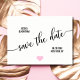 Elegant and modern SAVE THE DATE postcards to send your guests. White script calligraphy. Blush pink rose heart in middle. Online personalized templates for ease of editing. Add your text in front and back of card. Contact designer for special requests.
