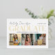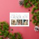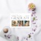 Two sided graduation announcement and grad party invitations feature a photo collage of 3 pictures on the front with modern and stylish real gold foil serif printing and white script typography design that can be personalized for the graduate. The back of the card features grad party graduation celebration information that can be customized for your special event. Includes a white background color and soft black wording.