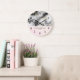 A personalized family clock with an elegant and modern marbled pattern. White, black and smoky grey marble with thin ribbons of faux-gold swirls throughout the pattern. A light pink gradient background beneath the marbled pattern. Art deco style clock face.