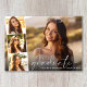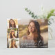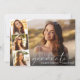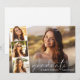 Elegant graduation announcement flat card featuring the graduate's photo overlayed with a strip of three smaller square photos and "graduate" in a thin modern white script and their name and class year in simple white typography.