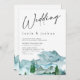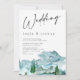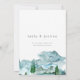 Simple and modern wedding invitation featuring a modern calligraphy heading and a mountain or wilderness watercolor scenery in blues, grays and green. This modern wilderness wedding invitation is ideal for a couple looking for a watercolor wilderness wedding invitation in a minimalist style.