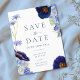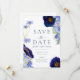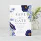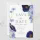 Beautiful elegant hand painted watercolor summer wildflowers in navy blue, cornflower blue, purple, green and yellow hues wedding save the date card. Flowers including cosmos, cornflowers, poppies and forget me nots with foliage. Easy to use template with modern elegant typography script. Perfect for a unique floral botanical navy blue themed summer or spring wedding. Unique original artwork by artist Catherine Sweetman