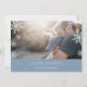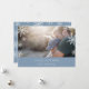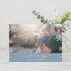 Modern, simple and minimal holiday photo card features your favourite horizontal or landscape oriented photo with a thick blue bottom border. Your custom greeting appears in modern white lettering (shown with "Joyous Hanukkah"), with your family name or names beneath. A subtle snowflake pattern is overlaid over the edges of your photo for festive appeal. Cards reverse to a wintry snowflake pattern in matching dusty medium blue and white.