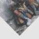 This decoupage tissue paper features a modern woman seated against a distressed brick wall, styled in bold contemporary fashion, paired with a striking black cat. The layered textures, expressive posture, and urban backdrop create a powerful narrative piece ideal for statement furniture and artistic decor.