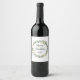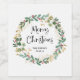 These simple and stylish wine labels feature a stunning watercolor wreath with green and faux gold leaves and red holly berries, and black modern script typography that says "Merry Christmas" on a white background.