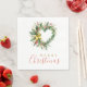 Each paper napkin features a modern design with a heart-shaped wreath adorned with poinsettias, holly branches, other festive plants, and an elegant ribbon. The script typography adds a refined and personalized touch, creating a unique and festive appearance that enhances your Christmas table setting.