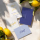 A fresh and elegant lemon wedding menu card featuring a soft blue palette with citrus-inspired details. The clean layout paired with handwritten script typography creates a light Mediterranean feel, perfect for summer weddings and destination celebrations.