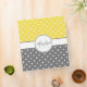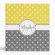 This cute monogrammed binder features a white polka dot pattern on a yellow and grey background. Personalize it with a name and monogram in matching grey shade in a round white frame. Add additional text on the spine. The colours and font styles are customizable.