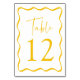 Add a stylish touch to your wedding celebration with these Modern Wavy Frame wedding table cards! The retro design displays "Table" in a handwritten yellow script with the table number shown below. A yellow wavy border surrounds the table number contrasting with a white background. The design repeats on the back. To order the table cards: Add each number to your cart individually and check out when you're finished. Do not order by quantity or you will receive multiples of the same number.