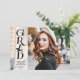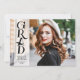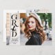 Envoyez ces annonces de diplômes simples, tendance et modernes et des invitations pour diffuser l'information de votre diplôme à votre famille et à vos amis! Ces invitations ont une photo à fond sur le devant avec une typographie contemporaine moderne GRAD noir debout sur une bande verticale de couverture blanche, avec le nom de la diplômée et l'année de classe. Le dos de la carte est personnalisable avec une deuxième image, avec le nom des parents du diplômé, et avec l'information de la cérémonie de remise des diplômes.