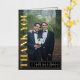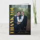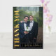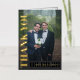 Carte de remerciements mariage plié avec du texte en feuille d'or, merci en lettres d'or en gras sur le côté, une photo mariage, votre date de mariage en chiffres noirs contre un arrière - plan gris foncé, vos noms en feuille d'or.