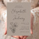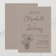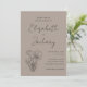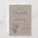 Ce faire-part de mariage moderne est composé de texte noir sur un arrière - plan taupe neutre. Un motif floral d'art linéaire apparaît dans le coin inférieur gauche. Ajoutez les noms du couple dans un script d'écriture manuscrite noir et les détails dans la police sans serif.