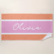 Cette serviette de bain personnalisée en rose rayé et orange est ornée d'un arrière - plan simple rayé orange, rose et blanc. Personnalisez-le avec votre nom, dans une police de caractères blanche simple et élégante.