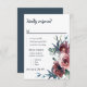 Éléments : aquarelle éléments floraux : roses, pivoines, eucalyptus verdoyant, feuillage. Polices serif aux accents de script vifs Couleurs : bordeaux, marron, marsala, framboise, mûre, rose, roussâtre, pêche, bleu poussiéreux, vert, bleu marine, bleu ardoise. Thèmes : moderne, fleurie, botanique, contemporain, chic, classique, jardin, simple, boho, pays, vignoble, cave. Collection : Collection moderne Floral Bourgogne Marine Peach Blush Mariage Collection. Type de produit : RSVP avec choix de menu