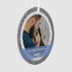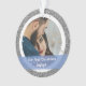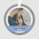 Splashy mais élégant Notre premier Noël Engagé photo personnalisée ornement de Noël pour les couples récemment engagés, avec typographie moderne cursive / lettrage à la main sur un élégant groupe semi-transparent bleu, un cadre de flocons de neige blanc et argent et de petites étoiles, et un autre cadre de parties scintillant en argent simulé. Assurez-vous de personnaliser au moins les deux photos (avant et arrière), les prénoms et l'année au dos.