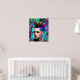 Mohawk punk rocker woman with colourful mohawk, tattoos and piercings and abstract fluid art background in black, purple, green and blue.