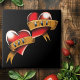 Traditional tattoo red hearts with Mom and Dad banners on both hearts in a backdrop of black.