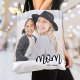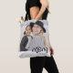 Simple Mom Personalized Tote Bag. Celebrate motherhood with this minimalist design featuring the word “mom” in a lowercase serif font across the bottom right for a warm and playful look. A white band runs along the bottom, where the text overlaps between the white and the photo for a clean, modern touch. You can add a personalized “est. year” to make it special for a mom-to-be, a new mother, or to celebrate mom any time. The design is printed on both sides, and you can include up to 3 years or shorten them (like 23' 24' 25'). Perfect for Mother’s Day or everyday use, this simple and timeless tote honours mom in style.