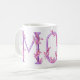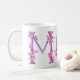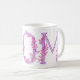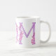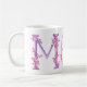 Typographical orchids around the letters MOM art mug. Pretty whimsical pink orchid watercolor art purple letter mug. Ideal for gifting Mom on Mothers day, a special birthday or another special occasion. © Original watercolor art and design by Sarah Trett. www.sarahtrett.com for www.mylittleeden.com