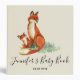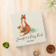 A baby book personalized binder, customize for other uses as well. Designed with a watercolor image of a mother and baby fox. The young fox is looking up at her mother with love and appreciation. Both sitting on some grass. Orange and tan colours. Spine and back are a vintage green colour.