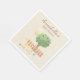 This custom baby shower napkin features a cute country farm animal theme. A gender neutral illustrated image of a mommy and baby duck are pictured walking beneath an apple tree. A little wooden picket fence is placed behind the tree and a big sun is shining over the ducks.