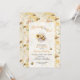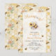This honeycomb baby shower invitation features a “Mommy to Bee” theme with a cute bee holding a sunflower, surrounded by flowers and bees on a warm honeycomb background. The playful design makes it a perfect personalized baby shower invitation.