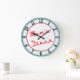 Moms Diner in neon red letters on a fun cooking decor kitchen wall clock, with black numbers on a light teal background giving this design a retro, 1950's faux-neon restaurant look.