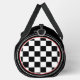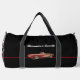 Ce sac en duffel élégant a un look sportif élégant qui comporte un clin d'oeil subtil aux voitures classiques. Ce sac noir a l'image d'une Corvette rouge vintage sur le devant. Sur les côtés se trouve un motif à damiers noir et blanc. Le texte peut être customisé.