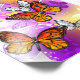 Orange, detailed monarch butterflies on light, purple, picturesque, painted background.