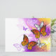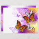 Orange, detailed monarch butterflies on light, purple, picturesque, painted background.