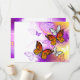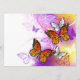 Orange, detailed monarch butterflies on light, purple, picturesque, painted background.