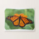 A beautiful monarch butterfly with its wings spread, has landed on a tithonia blossom. The soft green background make the image "pop".