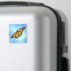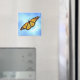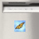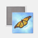 A photograph of a near perfect monarch butterfly against a blue sky with faint white clouds is used to create a monarch butterfly square magnet.