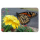 Photo of a monarch butterfly sipping nectar from a yellow zinnia flower.