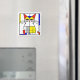 Abstract colourful geometric Mondrian style illustration of a cat with white, yellow, grey and red squares and black lines