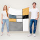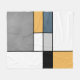 Abstract modern art with colourful (navy blue, grey, black, yellow, white) rectangles in Mondrian style on white background