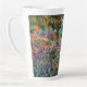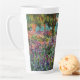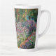 A Monet flower latte mug featuring beautiful pink and purple irises in a garden shimmering underneath tall trees. A great Monet gift for fans of impressionism and French art. Peaceful nature impressionism with lovely flowers and scenic landscape.