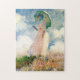 Monet Woman with a Parasol puzzle. Tempera on Canvas from 1886. One of French Impressionist Claude Monet’s most striking studies, Woman with a Parasol features a beautiful woman standing in a white dress with red corsage holding a green parasol as her blue scarf blows in the hot summer breeze. The girl stands on a grassy windswept hill with her skirt blowing in the wind as the clouds pass brightly behind her. A pretty art gift for fans of Claude Monet, Impressionism, and French art.