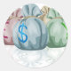 Money bag sacks containing different world currencies. Pound, dollar and yen symbols showing.