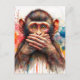 This postcard features colourful watercolor artwork of a monkey covering its mouth in the "speak no evil" gesture.